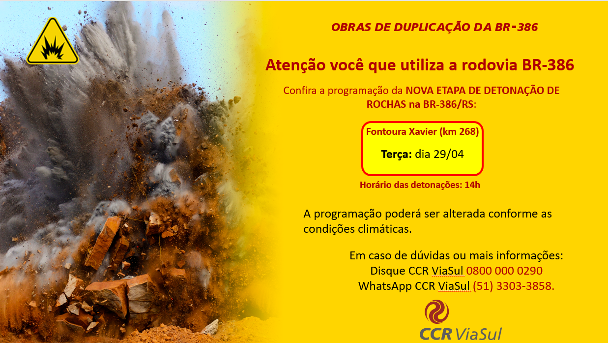 A CCR ViaSul divulga que, a partir das 14h desta terça (29), realiza mais uma etapa de detonação de rochas na região do km 268 da BR-386, em Fontoura Xavier (RS).