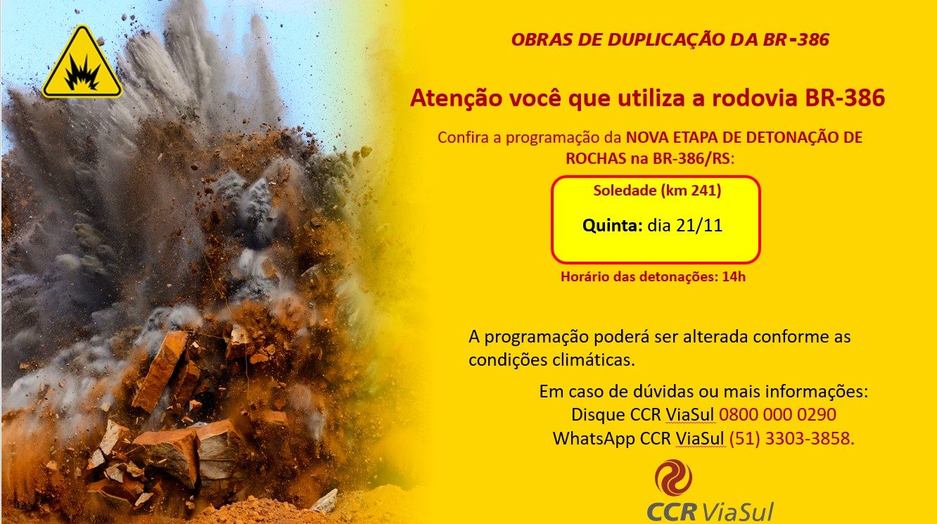 A CCR ViaSul informa que prevê a realização de uma detonação nesta quinta (21), na região do km 241 da BR-386, em Soledade (RS). A ação terá início às 14h.